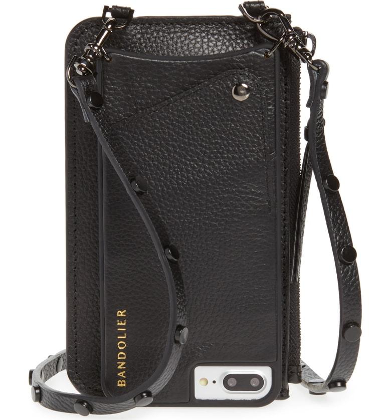 bandolier nicole crossbody phone case and wallet black leather with gold detail compatible with iphone 8 plus 7 plus 6 plus 6s plus only