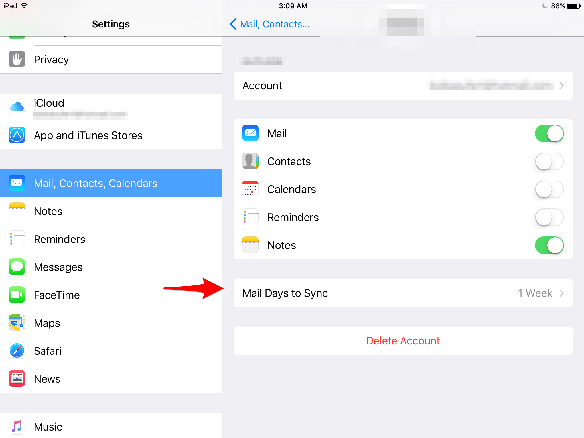 can t locate mail days to sync option